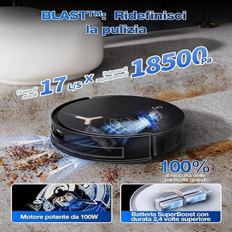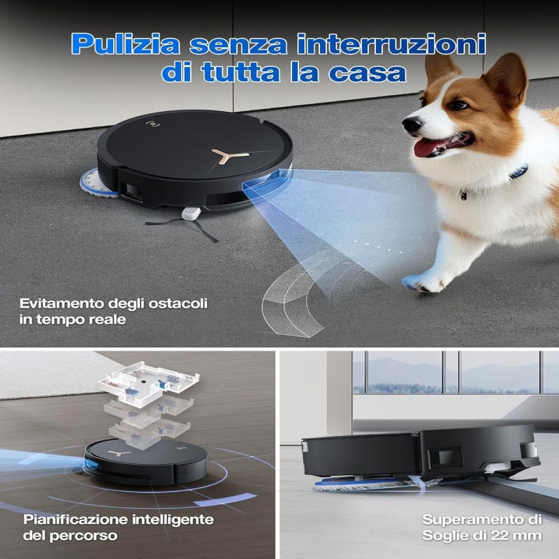• 【Stazione OMNI All-in-One】La stazione OMNI all-in-one offre funzionalità avanzate, tra cui svuotamento automatico e asciugatura ad aria calda a 45°C. Con raschietti bidirezionali e lavaggio con acqua calda a 75°C, pulisce automaticamente sia il mocio che la base tramite autopulizia automatica.
